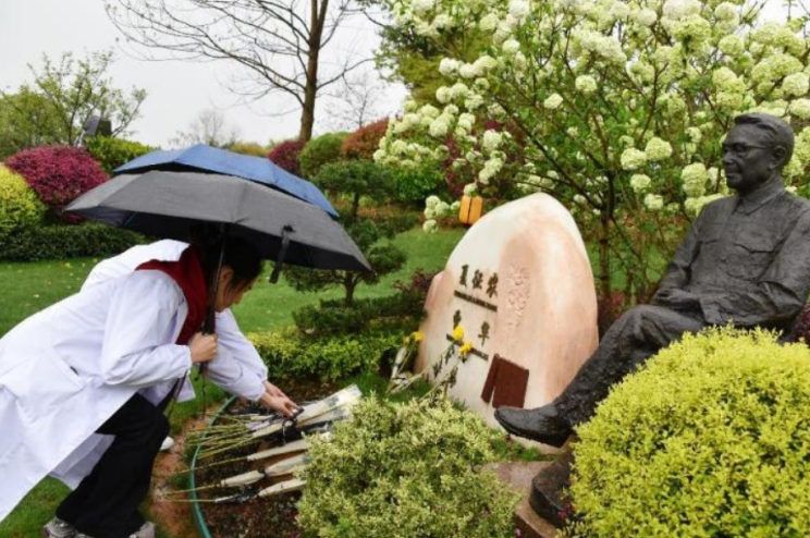 活动最后环节,同学们整齐列队在纪念园的夏征农雕塑前肃立默哀,仔细聆听先辈的生平业绩介绍,并敬献鲜花表达对这位革命前辈、著名教育家的深切缅怀。